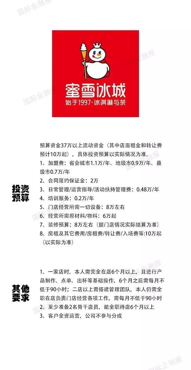 蜜雪冰城是37万元起步,这里面包含了10万元最低标准的店面租金和转让费,若去除这一部分,则其前期投资预算最低在27万元左右。该品牌也是唯一一家按城市能级收取加盟费的品牌,其中省会城市1.1万元/年、地级市0.9万元/年、县级市0.7万元/年,加盟客户全资运营,公司不参与分成。
