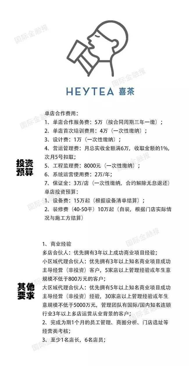 对比喜茶,其单店品牌服务费为5万元(三年一缴),培训费4万元、设计费1万元、工程监理费0.8万元、系统运营使用费2万元/年、保证金3万元/店,算上设备、装修费,最低门槛合计约41万元。