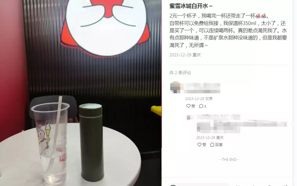 不过,这一模式与门店的服务存在一些冲突,消费者对瓶装饮料似乎并不买账。有不少网友表示,蜜雪冰城门店提供2元白开水服务,如果顾客自带杯还可以免费获得白开水,续杯无限制,比1.5元购买的一次性瓶装水性价比更高。