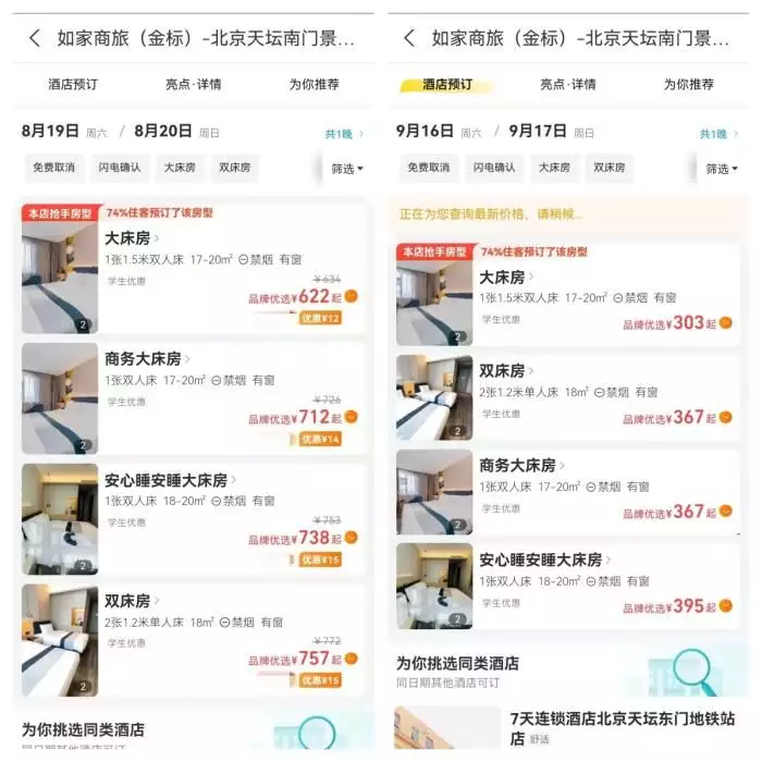 以如家商旅北京天坛南门景泰地铁站店的大床房为例,8月19日入住的价格是622元起,9月16日入住的价格仅为303元起,价格相差一倍。