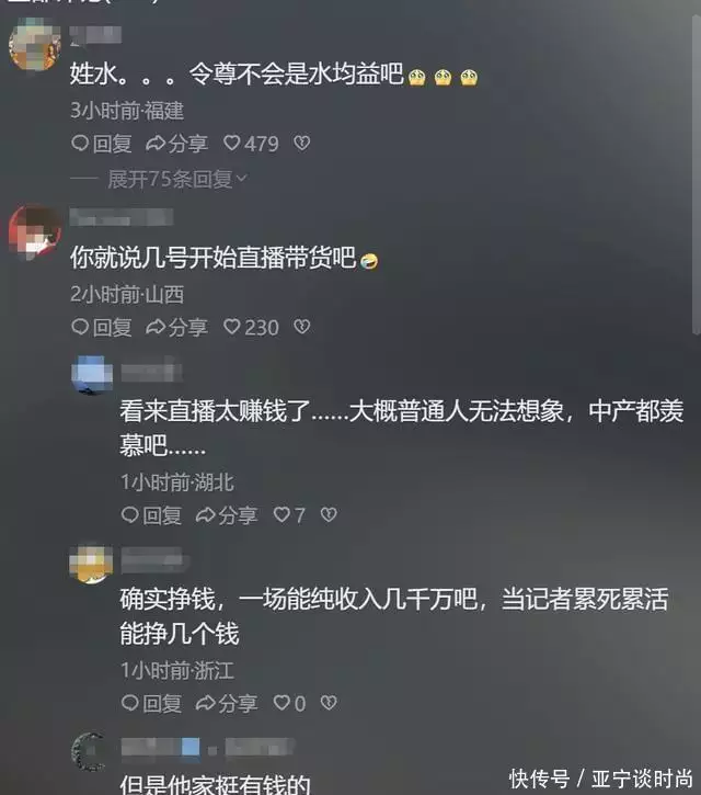 2024年1月13日,水均益的女儿水亦诗在社交媒体上官宣自己的最新动态:开始做直播带货了。短时间内迅速冲上热搜,引爆全网,网友对此也是褒贬不一。