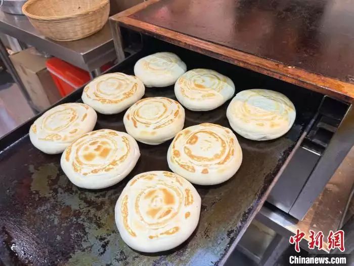 谈及白吉馍的关键制作技艺,他一边不紧不慢地制作,一边向记者介绍:“首先是把面粉发酵至嫩酵面团,再经揉面、揪挤、搓条、盘窝、擀饼、烙花、烤制等流程。烤熟后,双手一捏,就自然张开成酥脆的两张皮了。”