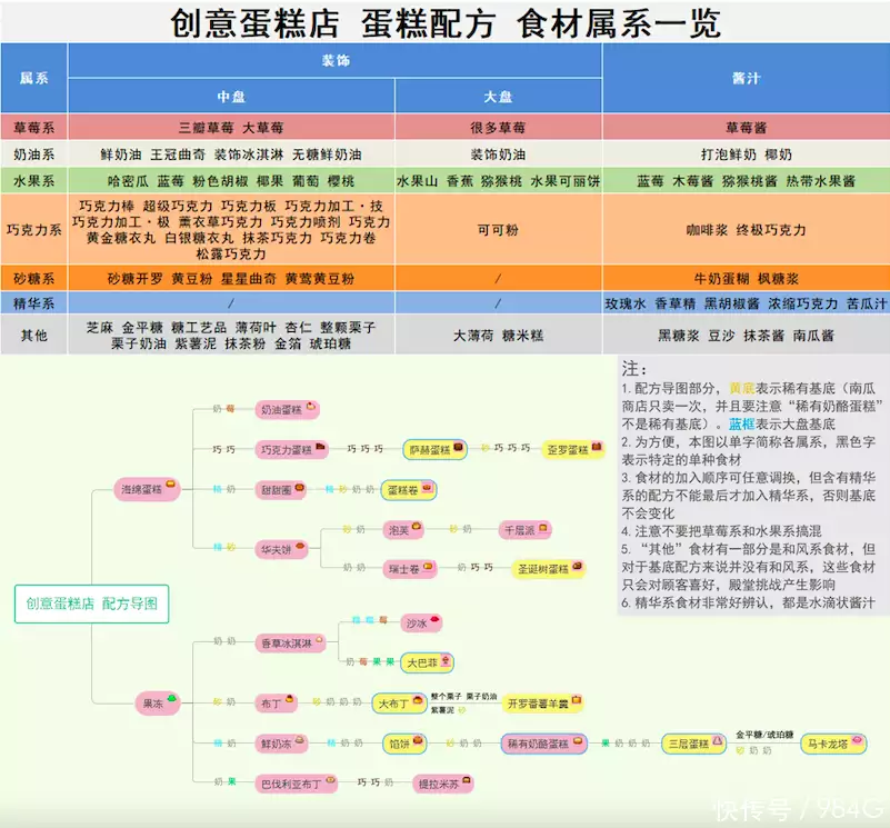 配方表中已经将创意蛋糕店中的食材分别归类,朋友们在制作之前只需要辨别好即可,切记不要被一些食材的名字骗了,比如咖啡浆听起来明明就是其他类的,结果却属于巧克力系,而牛奶蛋糊听起来怎么都像是奶油系,但却属于砂糖系,G哥在前期经常被食材的名字坑到。
