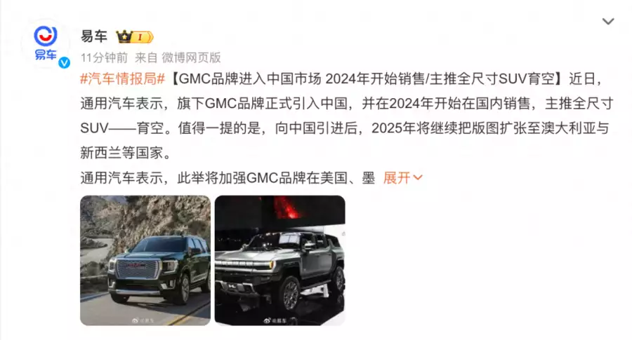 日前,美国通用汽车公司在声明中称,今年将开始在中国销售GMC Yukon育空全尺寸SUV,2025年GMC将扩至澳大利亚和新西兰。此前,通用汽车高端进口车平台道朗格透露,雪佛兰Tahoe太浩系列以及GMC YUKON育空将于2024年通过进口方式引入国内市场。