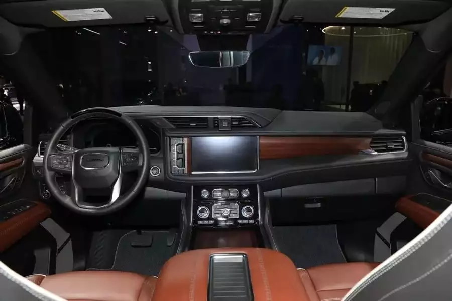 内饰方面,新车采用全新设计的中控台,造型规整、宽大,木饰板+皮质+缝线的用料颇具档次感。顶配的DENALI车型还配备了业界首创的电控移动前排中央扶手,模式状态丰富、变换灵活,同时提供了15英寸抬头显示器、全车9摄像头的全景影像等。另外,自动紧急制动在全新YUKON家族车型上为标配项目,流媒体后视镜和后方行人监测等则为选装项目。