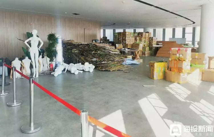 三楼大厅中摆放了不少废弃纸箱、货架、桌板、衣架、人形模特等杂物,且有围栏间隔,除此之外还有不少打包好的快递箱。