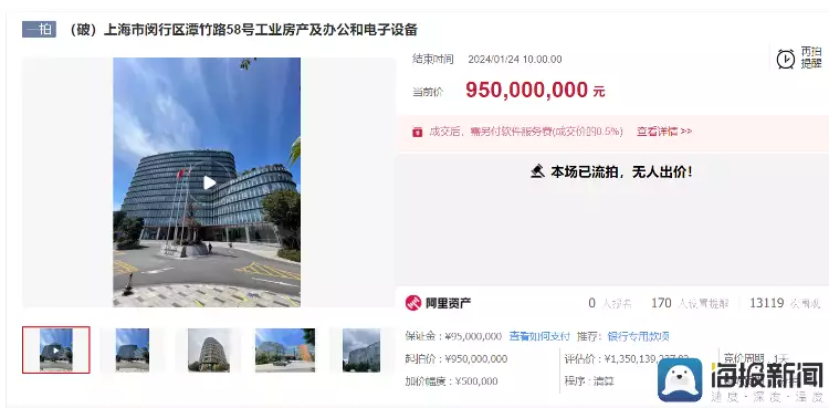 阿里资产平台显示,此次拍卖起拍价为9.5亿元。值得注意的是,平台显示该笔资产评估价约为13.5亿元,起拍价相当于打了约7折。1月24日,截至拍卖结束,无人报名出价,本场拍卖流拍。