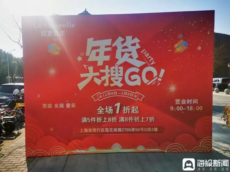 1月24日,记者来到闵行区拉夏贝尔总部基地,4幢已有不少楼层处于闲置状态,部分楼层仍有其他企业员工上班。在三楼卖场,广告牌宣传语称“全场1折起”,并且满5件折上8折,满8件折上7折,时间截止到2月6日。