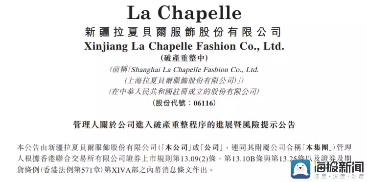 今年1月19日,拉夏贝尔在香港交易所发布公告称,公司已进入破产重整程序,截至目前,管理人正有秩序地进行破产重整相关工作。公告还表示,公司股份已于2023年2月7日起在香港联合交易所有限公司暂停买卖,并将继续暂停,直到另行通知为止。