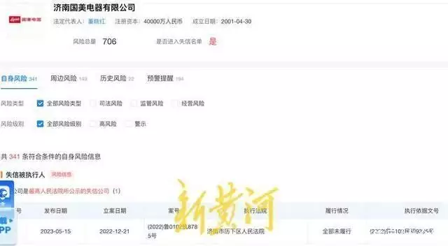 天眼查平台显示,今年7月以来,济南国美电器有限公司新增3则被执行人信息,执行标的合计317万余元,涉及合同纠纷等案件,执行法院分别为青岛市市北区人民法院、聊城市东昌府区人民法院、淄博市张店区人民法院。目前,该公司已被列为失信被执行人,存在多条限制消费令以及终本案件信息,未履行金额超1077万余元。