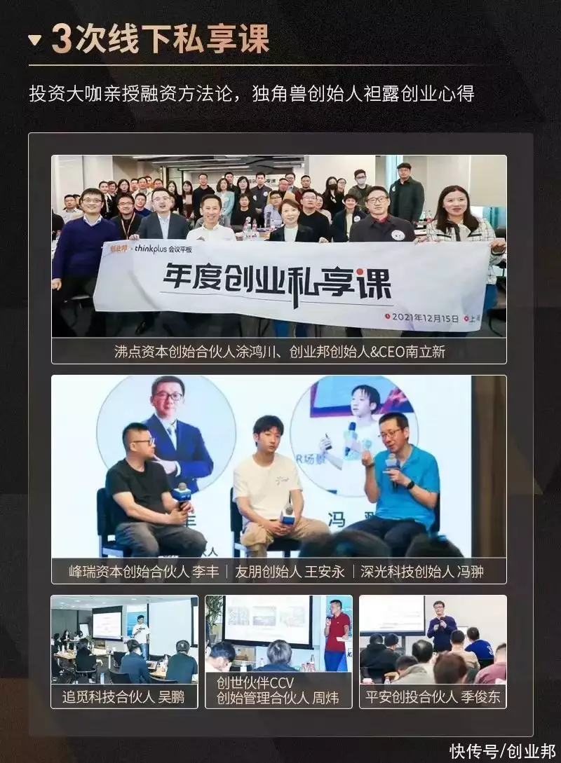会员还可以参加创业邦多种丰富多彩的线下活动。“会员线下大课”将邀请顶级投资人和独角兽企业创始人,为大家关心的创业问题指点迷津,同时链接优质创投资源。