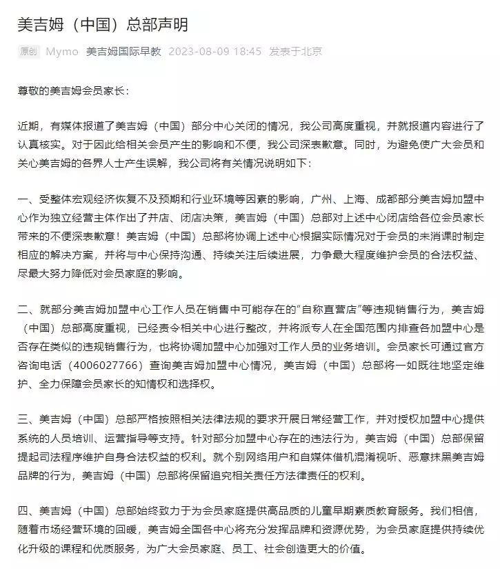 中新经纬8月11日电 针对“部分加盟中心关闭”一事,美吉姆(中国)总部日前通过微信号“美吉姆国际早教”发声明道歉,并称将协调制定解决方案。