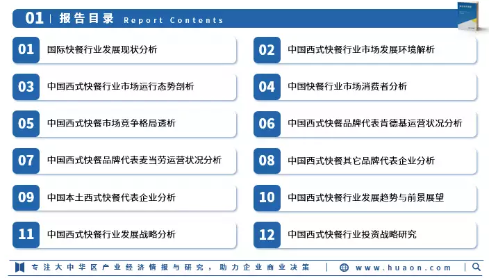 2024-2030年中国西式快餐行业市场调查研究及投资潜力预测报告西式快餐行业发展环境、市场运行现状进行了具体分析,还重点分析了行业竞争格局、重点企业的经营现状,结合西式快餐行业的发展轨迹和实践经验,对未来几年行业的发展趋向进行了专业的预判。是企业、科研、投资机构等单位了解行业最新发展动态及竞争格局,把握行业未来发展方向、提高企业经营效率、做出正确经营决策不可或缺的重要工具。