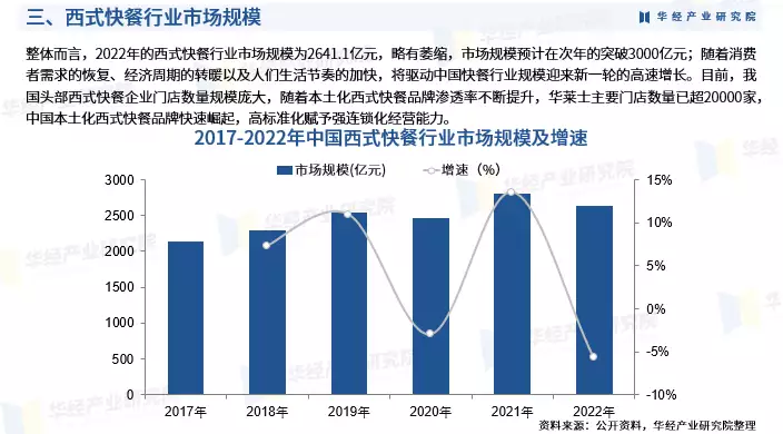 整体而言,2022年的西式快餐行业市场规模为2641.1亿元,略有萎缩,市场规模预计在次年的突破3000亿元;随着消费者需求的恢复、经济周期的转暖以及人们生活节奏的加快,将驱动中国快餐行业规模迎来新一轮的高速增长。
