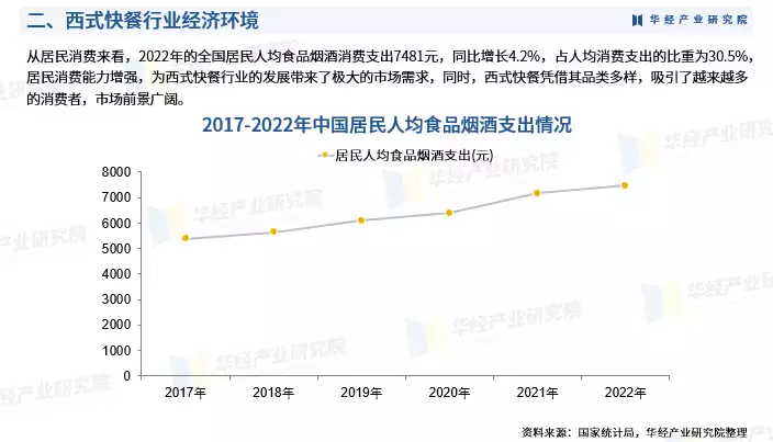 从居民消费来看,2022年的全国居民人均食品烟酒消费支出7481元,同比增长4.2%,占人均消费支出的比重为30.5%,居民消费能力增强,为西式快餐行业的发展带来了极大的市场需求,同时,西式快餐凭借其品类多样,吸引了越来越多的消费者,市场前景广阔。