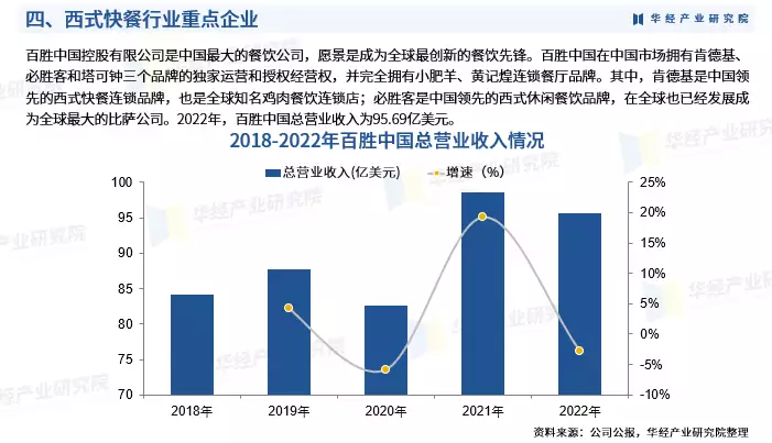 百胜中国控股有限公司是中国最大的餐饮公司,愿景是成为全球最创新的餐饮先锋。百胜中国在中国市场拥有肯德基、必胜客和塔可钟三个品牌的独家运营和授权经营权,并完全拥有小肥羊、黄记煌连锁餐厅品牌。其中,肯德基是中国领先的西式快餐连锁品牌,也是全球知名鸡肉餐饮连锁店;必胜客是中国领先的西式休闲餐饮品牌,在全球也已经发展成为全球最大的比萨公司。2022年,百胜中国总营业收入为95.69亿美元。