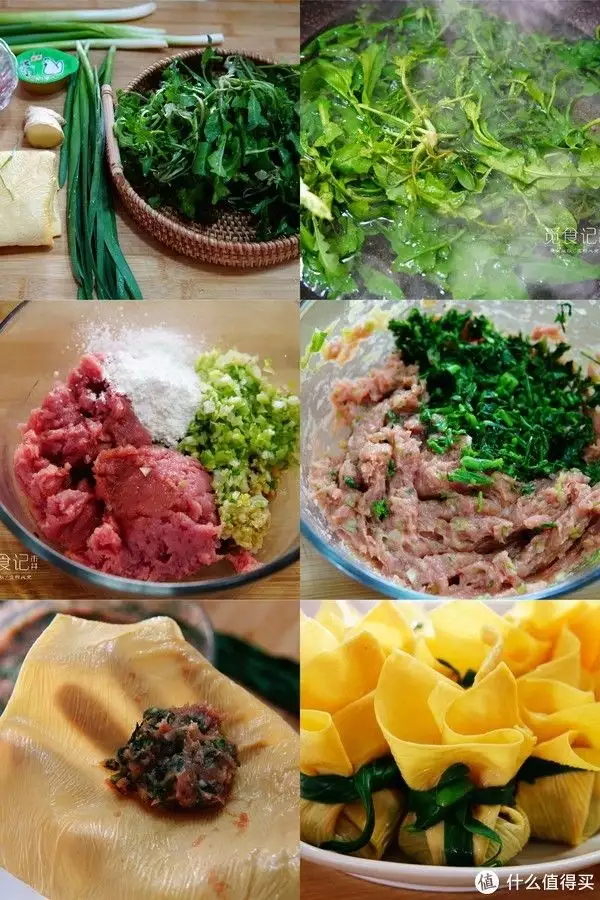 【主料】:荠菜半斤、瘦肉馅3两、油皮3张