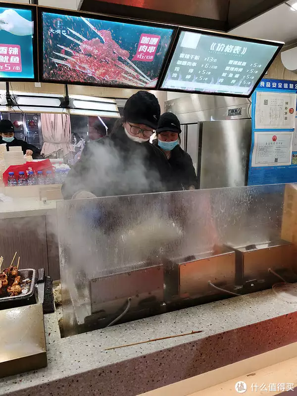 店里除了卖酸辣粉,另外的窗口也在卖炸串。鱿鱼5元/串,咖喱鸡肉6元/10串。