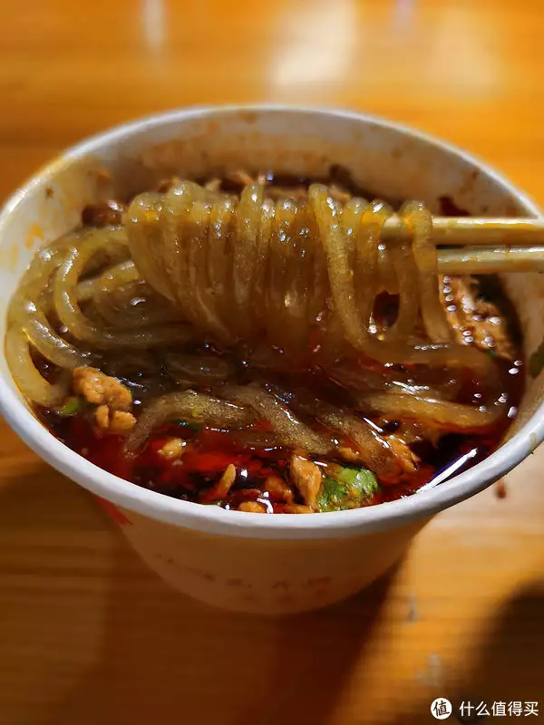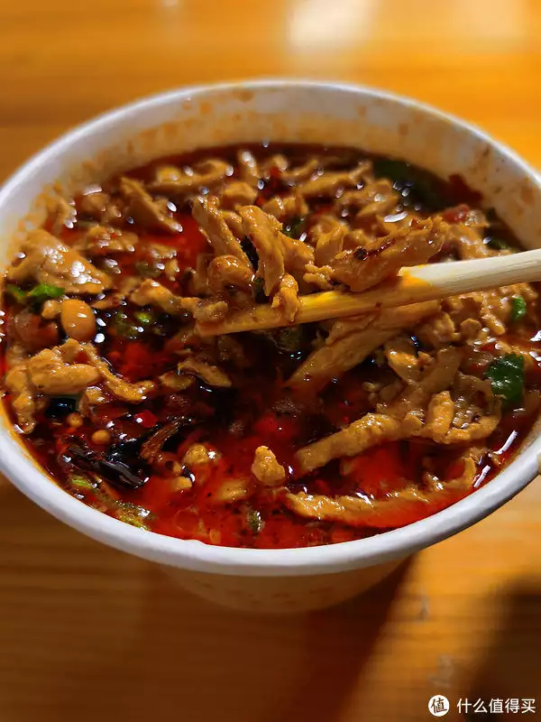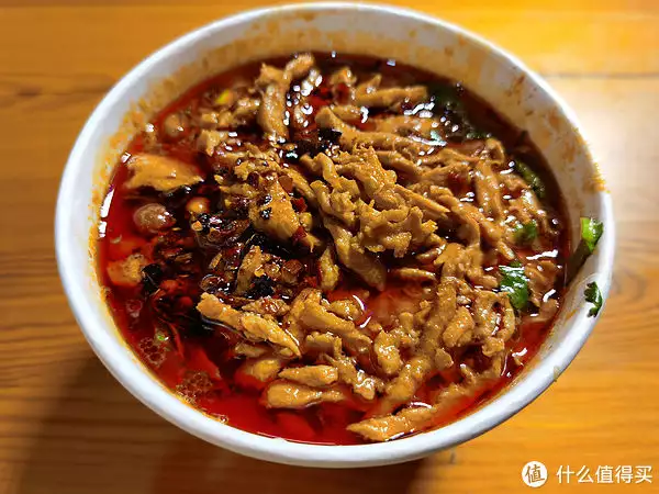 上面一层肉码着,虽说是鸡肉,成本不会特别高,但这份量也是让人赞叹。看起来红彤彤的实际上并不会很辣,酸辣粉酸味比较浓郁,调味里还能吃出麻酱的滋味,我觉得这就是大嘴巴酸辣粉的特色之处吧。