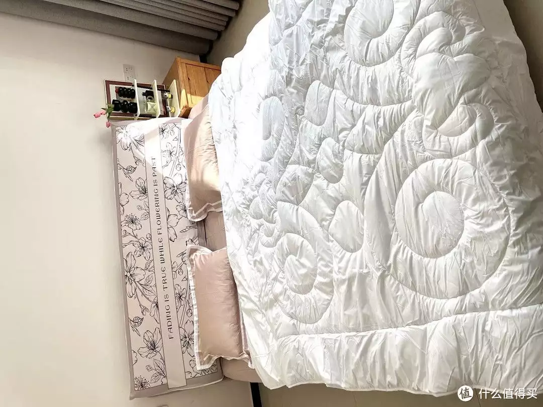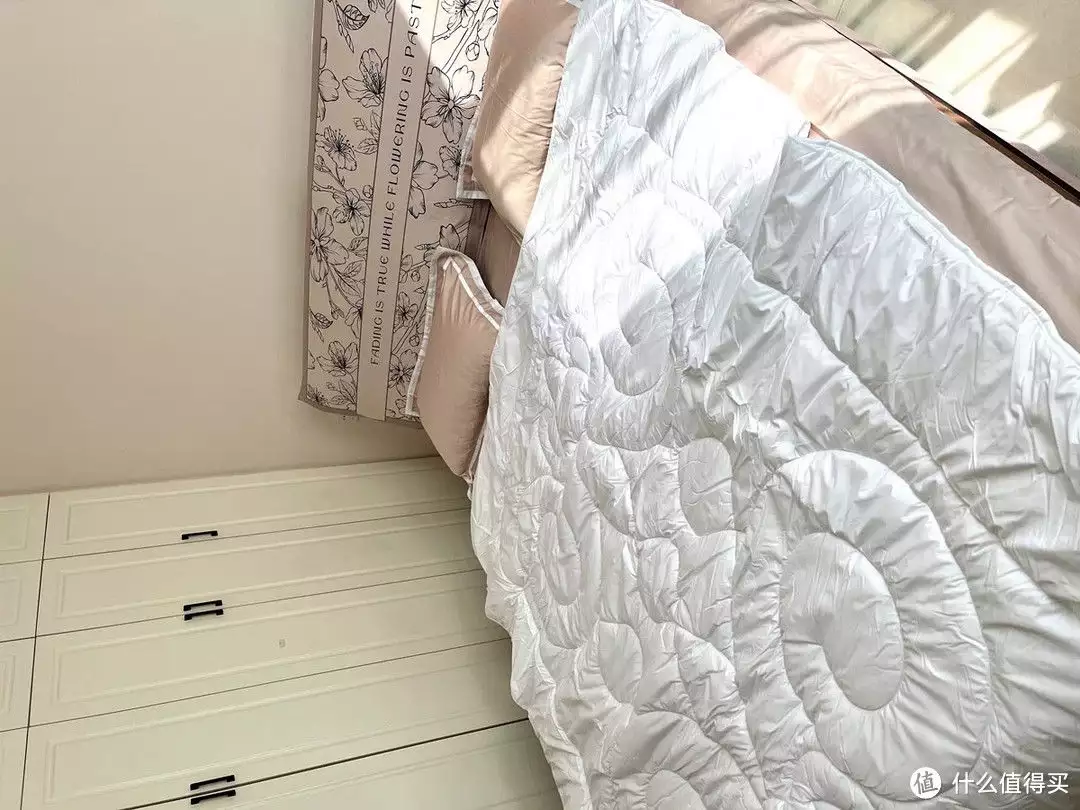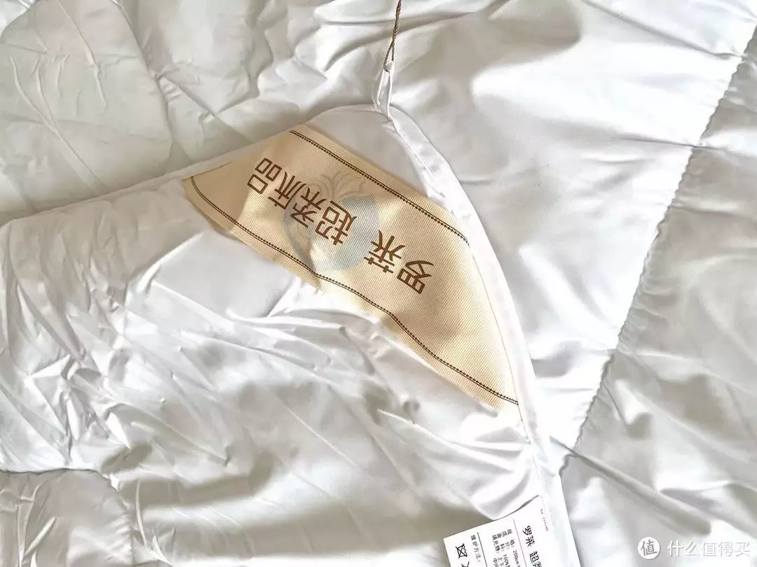 罗莱家纺的这款羊绒被真的非常出色!被子是双面的颜色设计,一面是纯净的白色,另一面则带有一点淡雅的蛋青色,让人感觉十分清新。我伸手摸了摸,被子的手感非常不错,柔软顺滑,让人忍不住想要亲近。