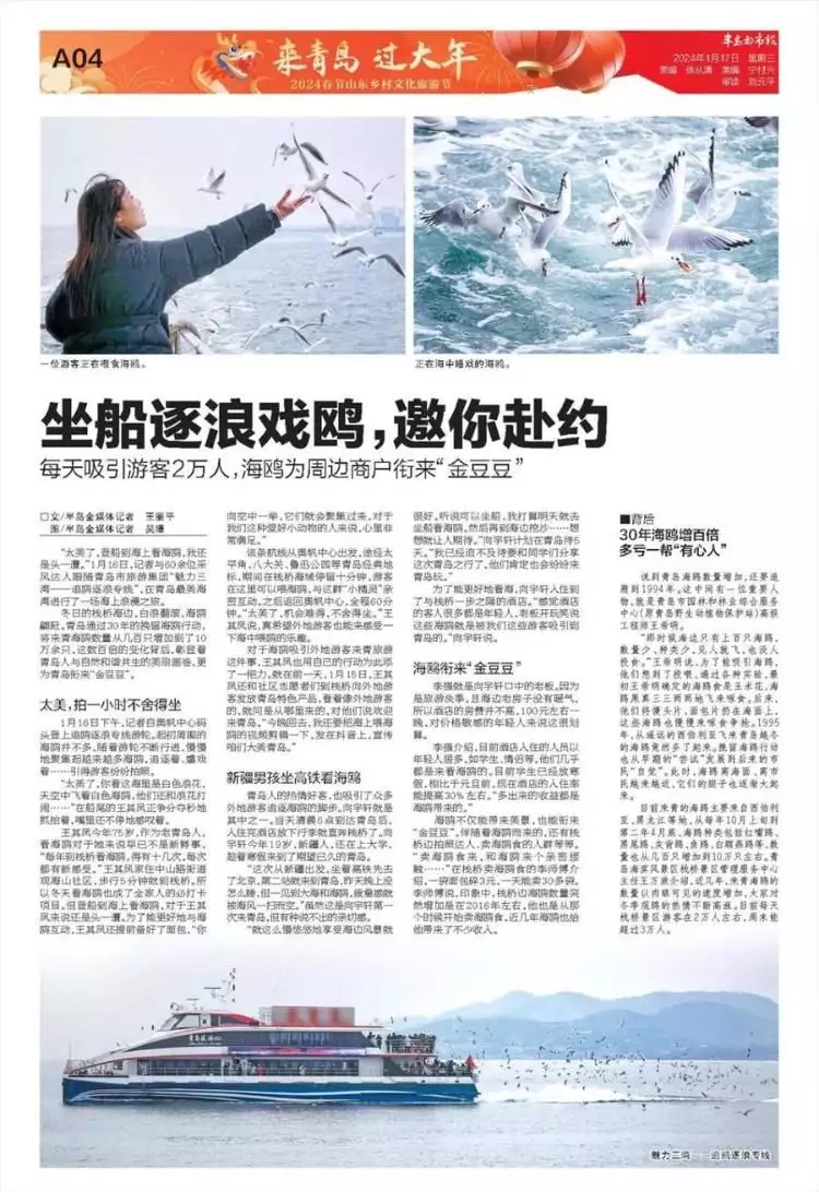 1月16日,记者与60余位采风达人跟随青岛市旅游集团“魅力三湾——追鸥逐浪专线”,在青岛最美海湾进行了一场追鸥逐浪的海上浪漫之旅。