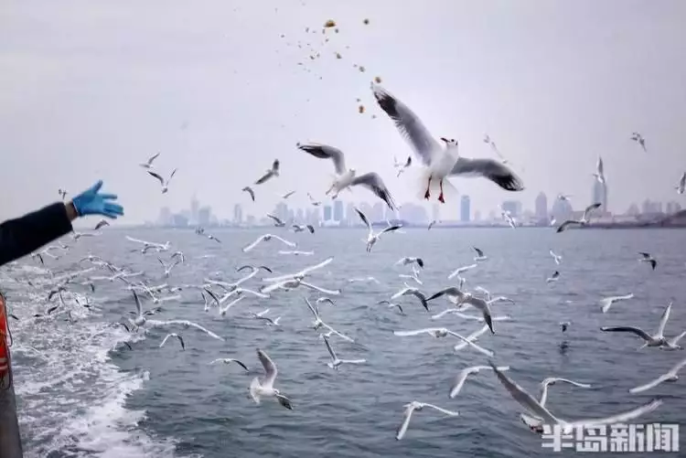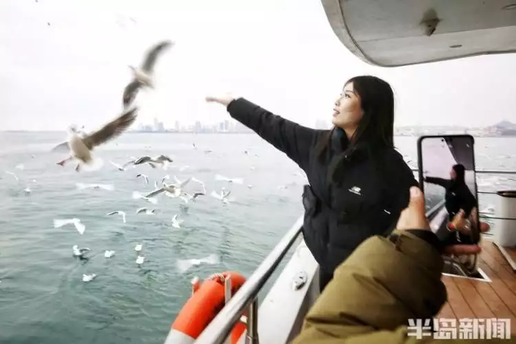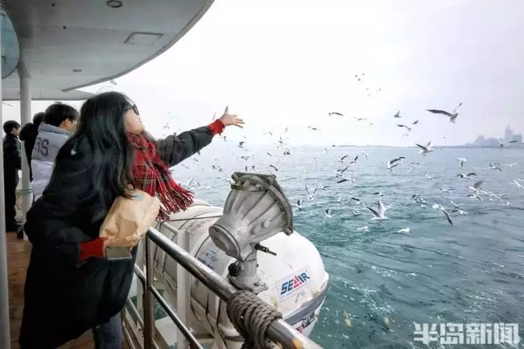 当天下午天气转阴,海上气温偏低,但这一个小时的航程中,王其凤都在甲板上拍照,“太美了,机会难得,不舍得坐。”王其凤说,真希望外地游客也能来感受一下海中喂鸥的乐趣。