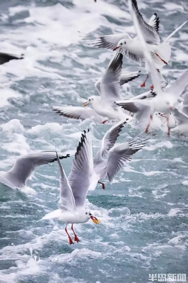 海鸥吃着我们喂的爆米花豆豆,但是在他们的追波逐浪中,也带动青岛冬季经济发展,为我们衔来“金豆豆”。