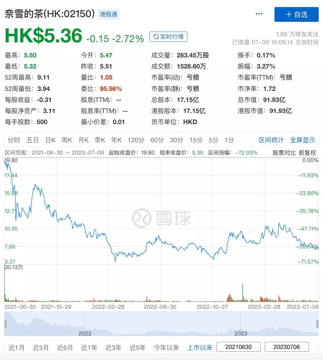 但奈雪上市后的成绩并不理想,上市当日即破发,此后股价一路下滑,从2021年7月1日的开盘价18.86港元/股跌至5.36港元/股(截至7月6日收盘),市值蒸发超228亿港元。