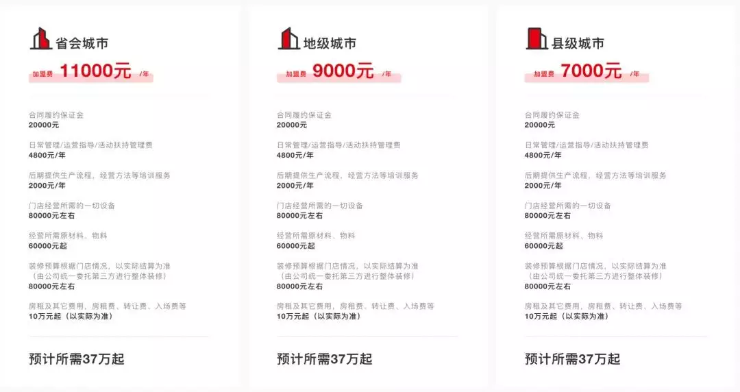 当然,据官网所示的加盟费用来看,前期预算23万元起,再加上品牌授权费、各类服务费、装修、设备、保障金等费用,想要开一家古茗至少得花56万。相比之下,蜜雪冰城的加盟总费用大概在40万左右。