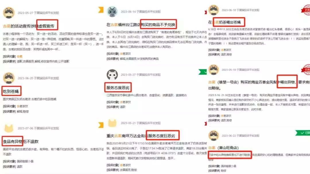 据笔者不完全统计,近两年内,古茗旗下存续门店共有22家受到行政处罚,罚款总金额为17.65万元,其中涉及食品安全问题的罚款金额超过10万元,包括原材料过期、食品腐烂变质等。而在黑猫投诉平台,古茗则累计收到814条投诉。