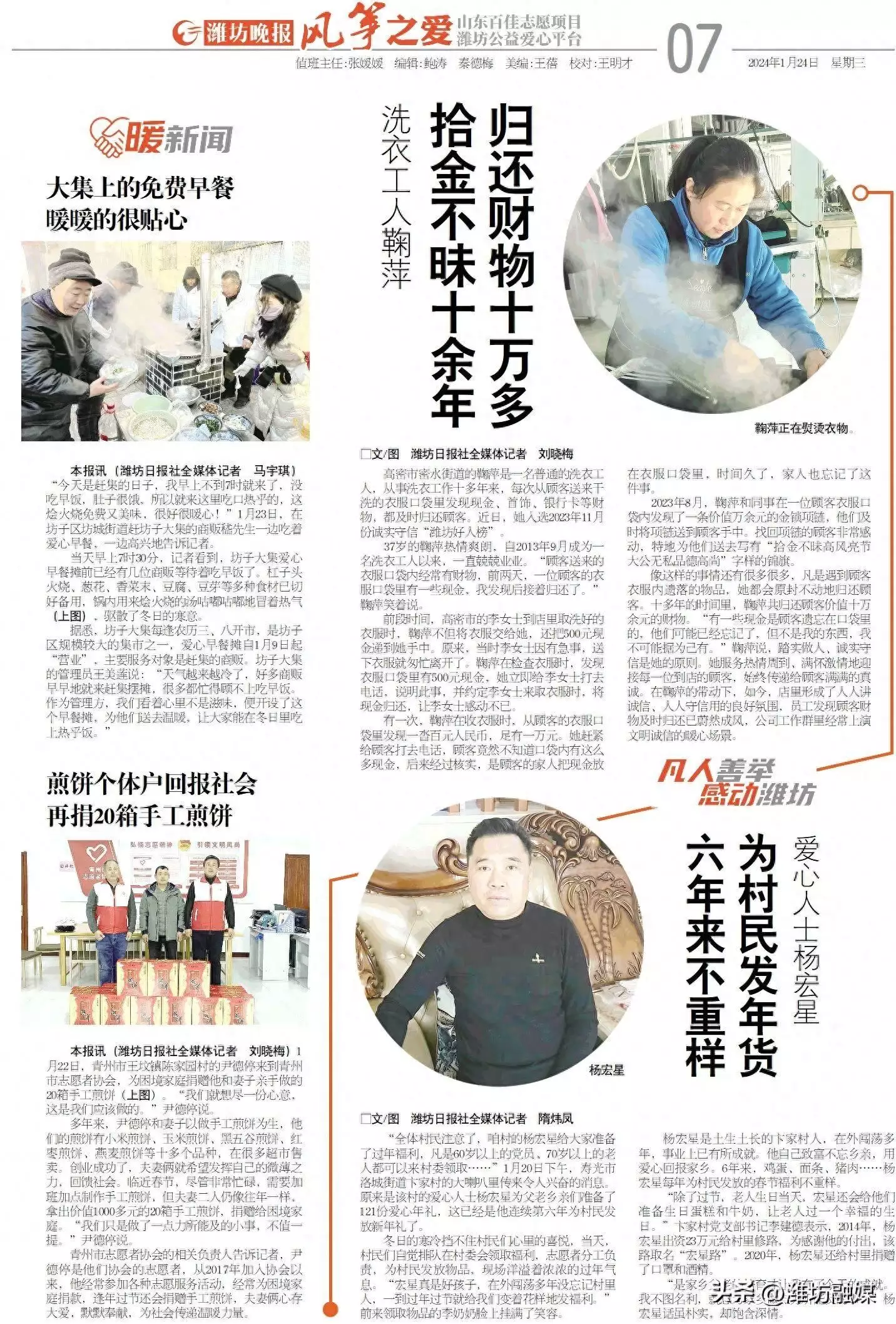 核心提示:潍坊日报社潍坊融媒讯 高密市密水街道的鞠萍是一名普通的干洗店洗衣工人,从事洗衣工作十多年来,每次从顾客送来干洗的衣服口袋里发现现金、首饰、银行卡等财物,都及时归