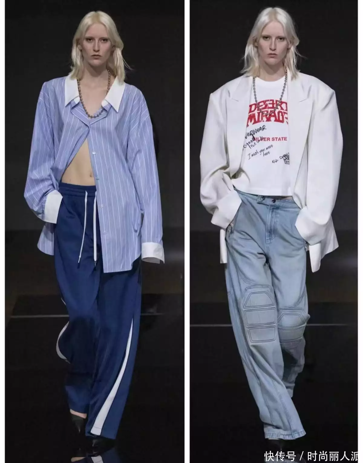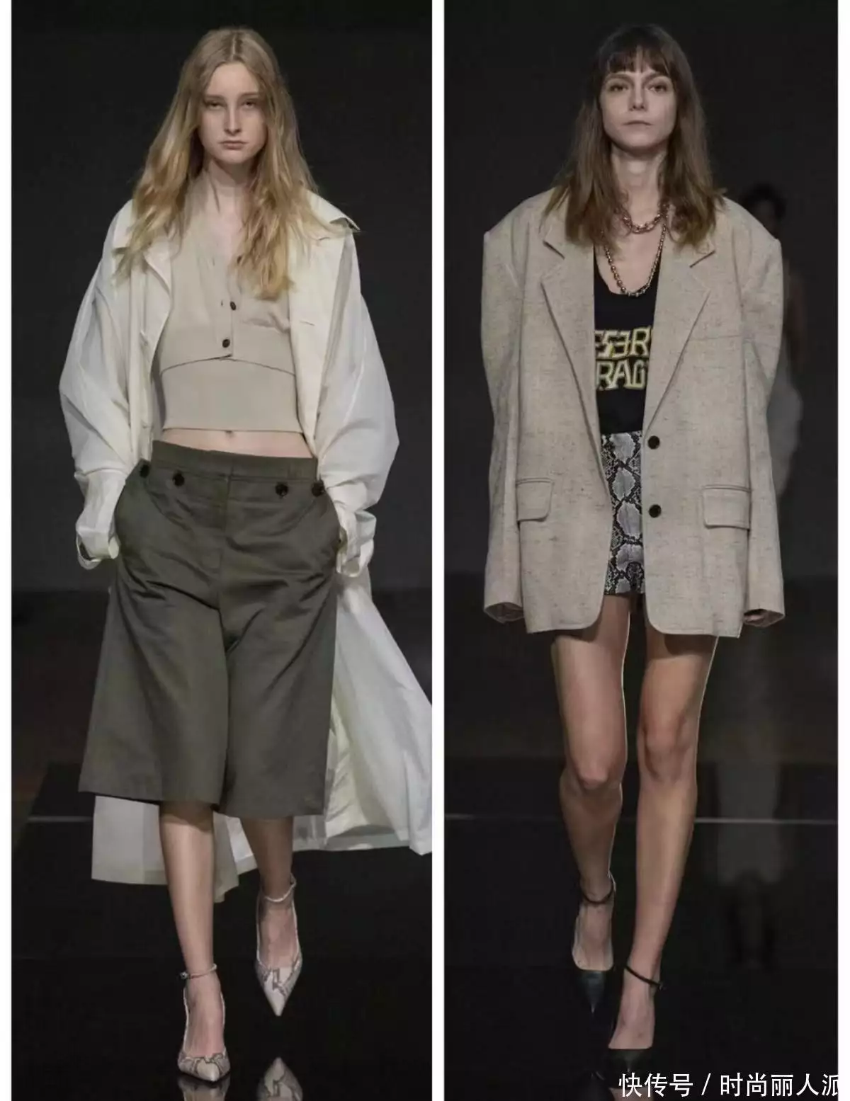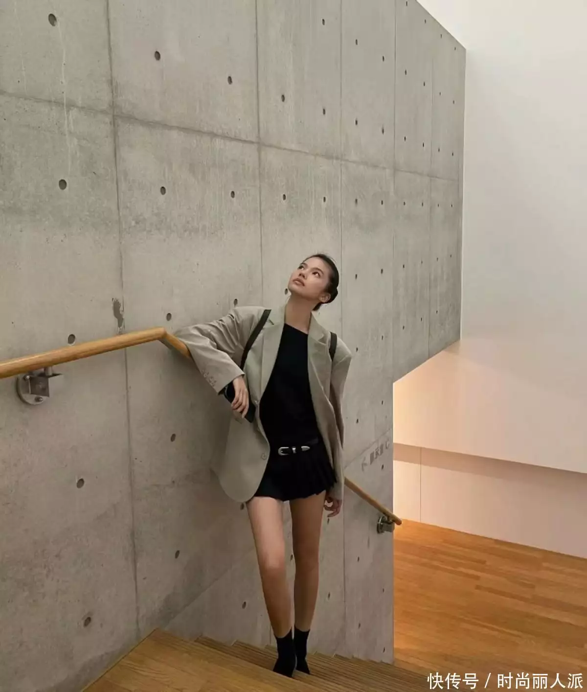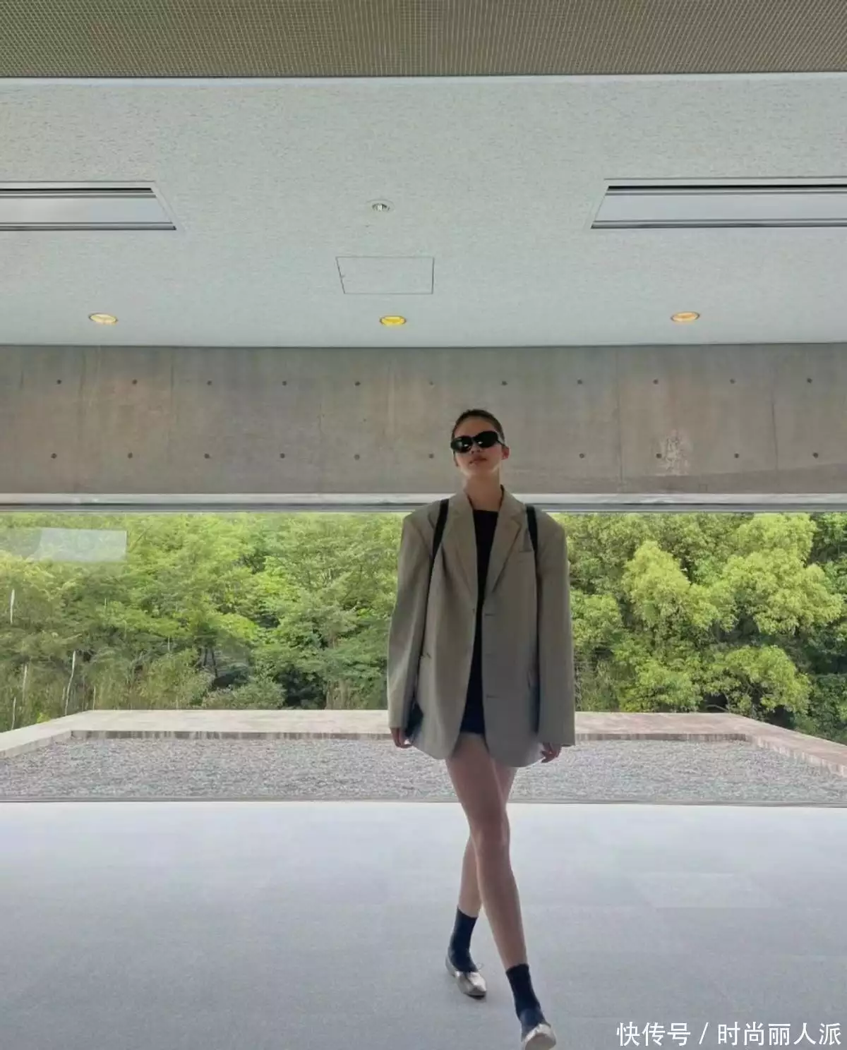 而且在穿搭方式上,因为西装的衣服够长,往往我们会选择下衣失踪的方式,穿出超模的大长腿。
