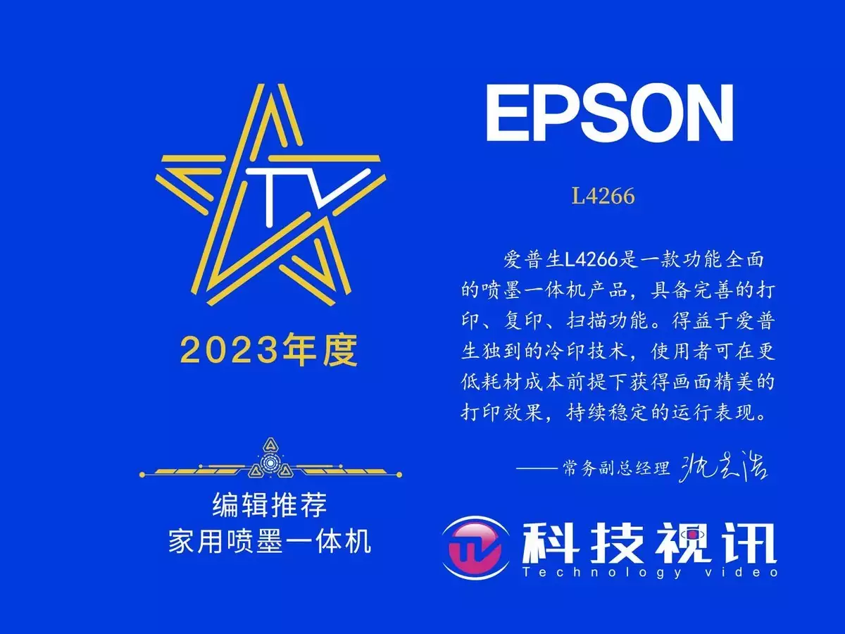 在科技视讯2023年终评选盛典中,经过对市场上多款打印机产品的综合评定,爱普生L4266在众多产品中脱颖而出,一举获得了“年度编辑推荐家用喷墨一体机”大奖。