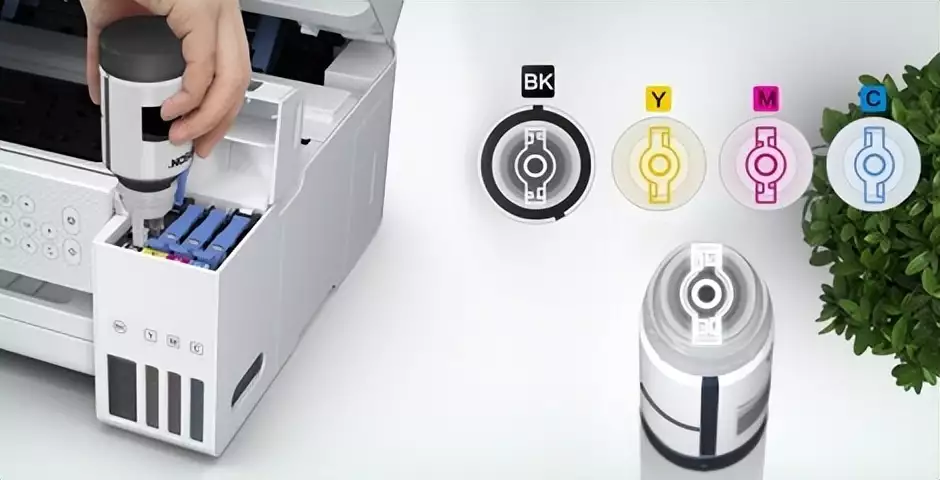机器正面右侧的墨仓位置特地开启了四条纵向“窗口”,从中可以观测到黑色和Y\M\C三色墨水的余量。当墨水余量下降到最低刻度线时就必须添加墨水,否则继续使用很可能会损坏机器。此时,打开墨仓盖后,按照匹配的颜色直接进行注入即可。不同颜色墨仓的灌注口采用不同的形状设计,和相应颜色的墨水瓶瓶口一一对应,避免了倒错墨水的麻烦,设计细节到位且颇具实用性。