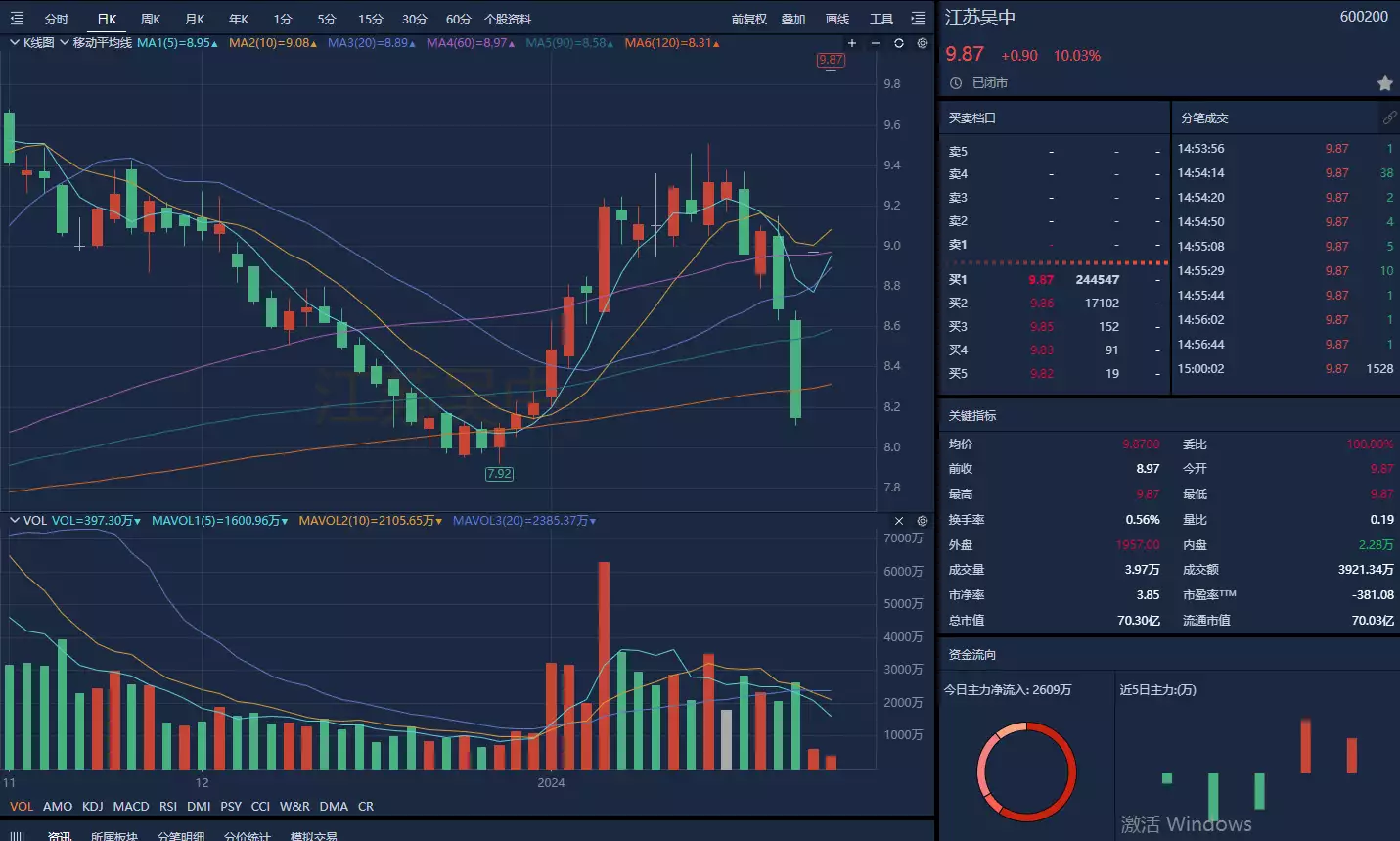 受利好消息刺激,截至1月24日,公司股价实现二连板。南财金融终端显示,江苏吴中股价自2023年11月1日盘中上探近3年新高后回调走弱,12月底起止跌企稳,2024年以来累计涨超20%。