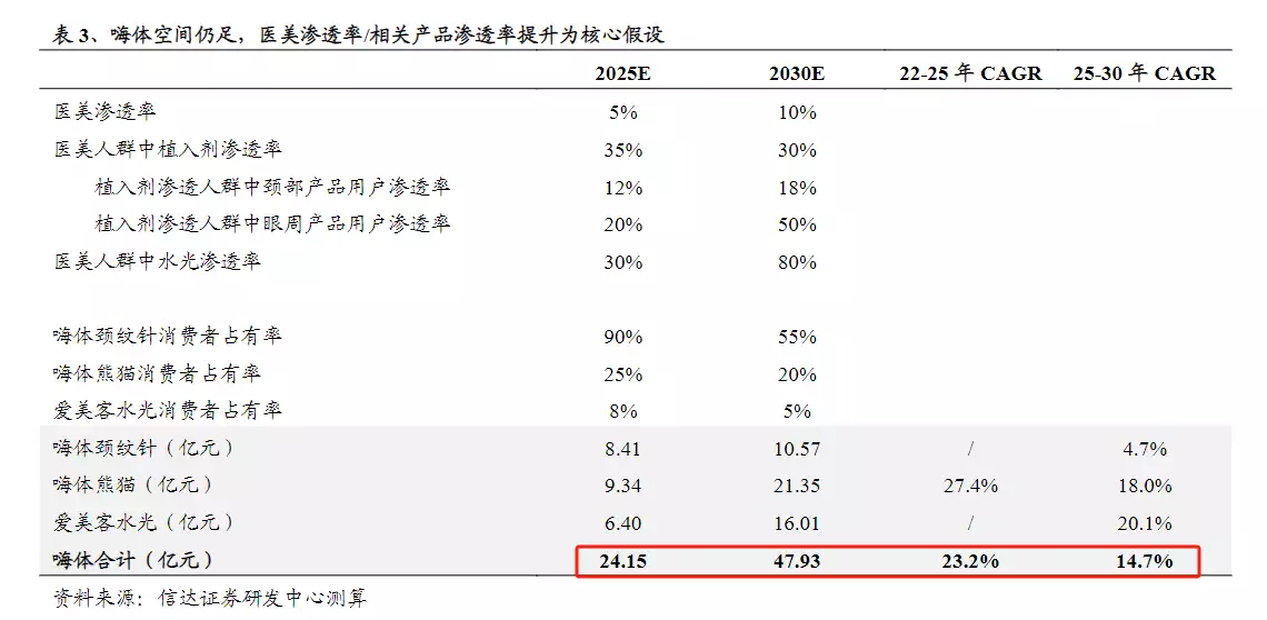 嗨体:2025年嗨体系列有望3年CAGR达23%,熊猫针、水光为核心增长产品。其中,信达证券预计,2025年嗨体熊猫针有望获批眼部适应症,获批后市场团队将联合机构探索更优的疗程方案,估计2025年嗨体熊猫达到25%的消费者占有率。< style="text-align: left; margin-bottom: 10px;">