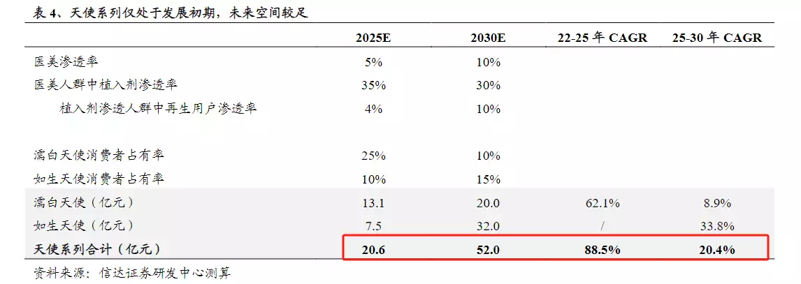 天使系列:随着更多医生认可并愿意使用、推广再生类产品,预计濡白天使、如生天使覆盖机构的广度和深度均提升,如生天使的覆盖人群或高于濡白天使,天使系列2022—2025年CAGR有望达80%。 < style="text-align: left; margin-bottom: 10px;">