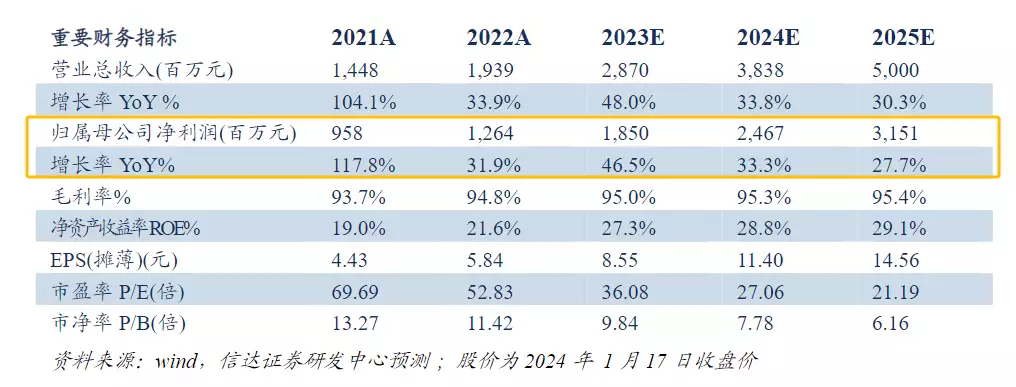 业绩预测信达证券预测,2023—2025年公司归母净利润分别为18.5/24.7/31.5亿元,同比分别增长46.5%/33.3%/27.7%,对应1月17日收盘价PE分别为36/27/21倍。