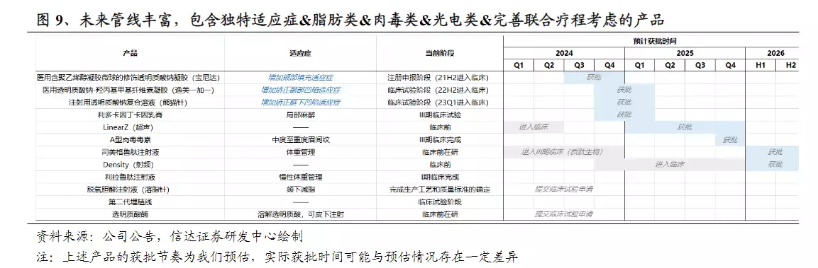 未来,从目前排队审批列表来看,公司在研管线充足。在独特适应症、脂肪类、肉毒类、光电类、联合疗程均有布局,包含司美格鲁肽注射液等热门概念。信达证券预计,根据公司以往现象级品牌公式,公司管线中现象级单品或现象级联合疗程推出概率较高。