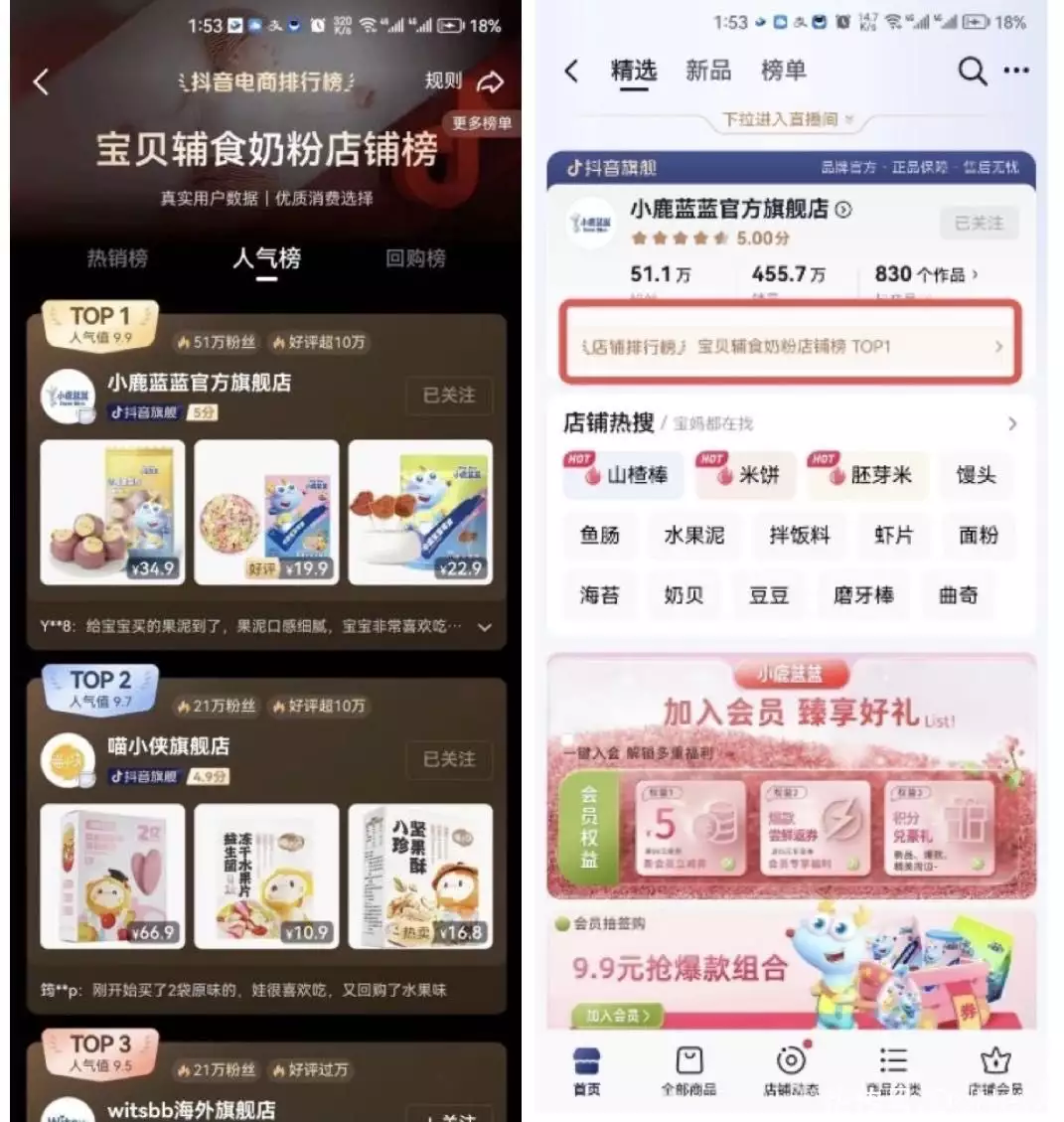 在今年抖音618好物节上,小鹿蓝蓝登上了宝宝辅食品牌和婴童零食品牌两个榜单的TOP10(按销售额排名)。