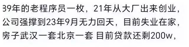 破产后不知道干点啥,一直处于失业在家的状态。只能靠吃之前当程序员时候攒下的老本“房子2套,1套在北京,一套在武汉,两套房子都还有贷款未还清,目前自己的存款还有40余万,但是贷款还剩200多万,月供18000”,自我感觉前途一片渺茫。