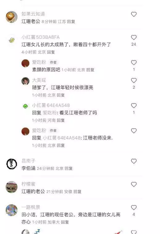 有网友觉得江珊女儿长得太成熟了,虽然才25岁,但瞅着四十都开外了,偶遇的网友回应称,素颜的原因吧。