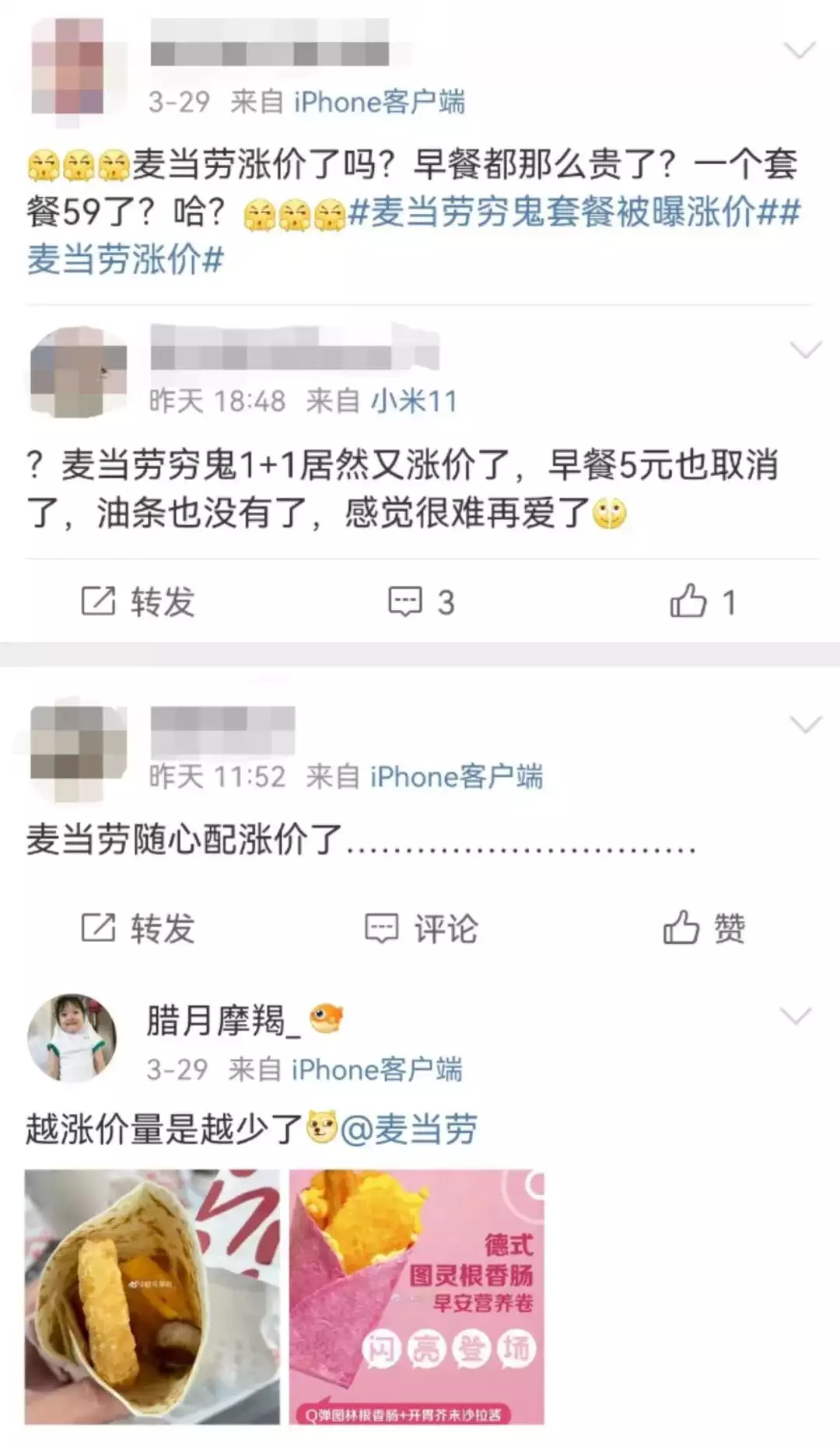 在社交平台上,麦当劳涨价一事遭到不少网友的吐槽。前不久,被戏称为“穷鬼套餐”的麦当劳1+1随心配套餐从12.9元提价至13.9元,有网友大呼“很难再爱了”,还有消费者称将考虑其他快餐品牌。