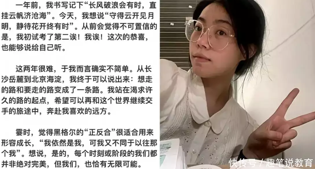 五年后,凭借刻苦的学习,这个女生考上了中国政法大学的研究生,虽然是哲学专业,但是学校已经比湖南涉外经济学院这样的专科学校已经是天渊之别。而如果她继续坚持下去考博的话,等博士毕业,前景一片光明。