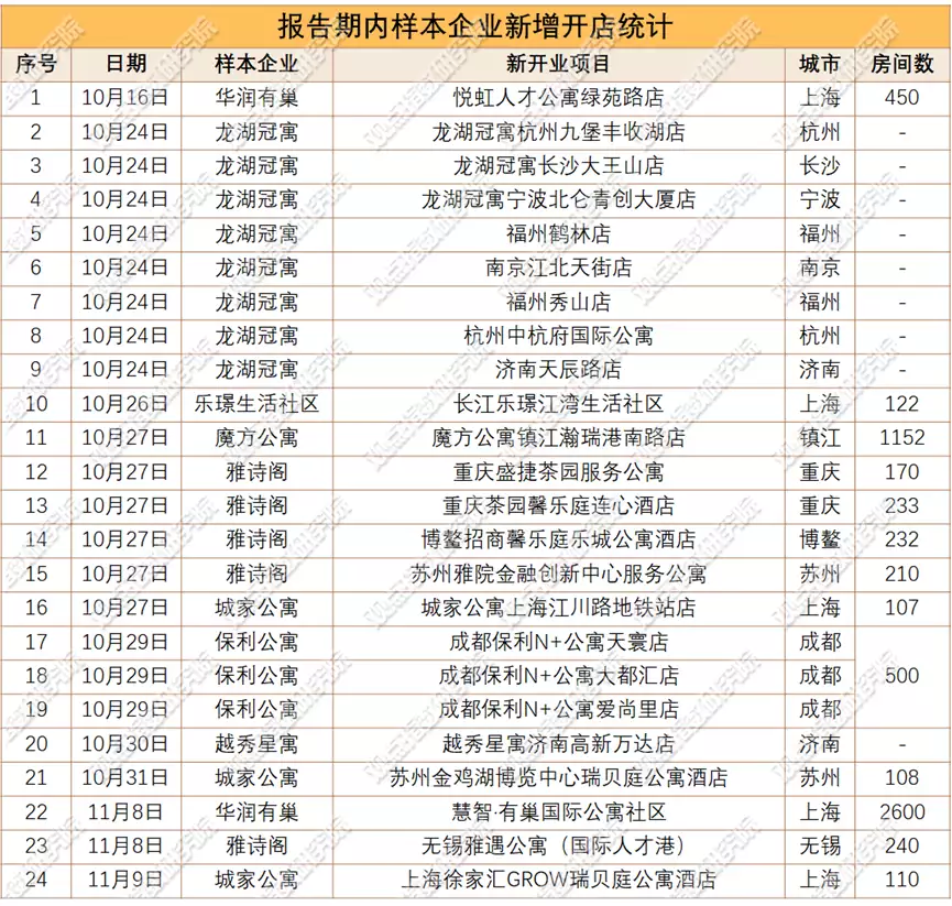 新开产品囊括普通公寓、蓝领公寓、保租房以及服务式产品。开店企业包括保利公寓、城家公寓、华润有巢、乐璟生活社区、龙湖冠寓、魔方公寓、雅诗阁以及越秀星寓。