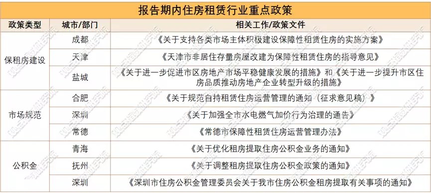 回顾期内颁布的住房租赁市场相关政策文件,保租房筹集建设仍是重点,同时规模住房租赁市场以及优化租房提取公积金业务也是重要内容。