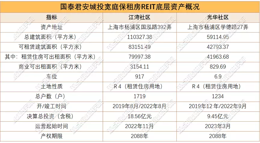 该REIT底层资产包括2022年11月开业的江湾社区以及今年3月开业的光华社区,两者属于租赁住房用地新建项目,早前拿地总价分别为6.76亿元以及3.55亿元。