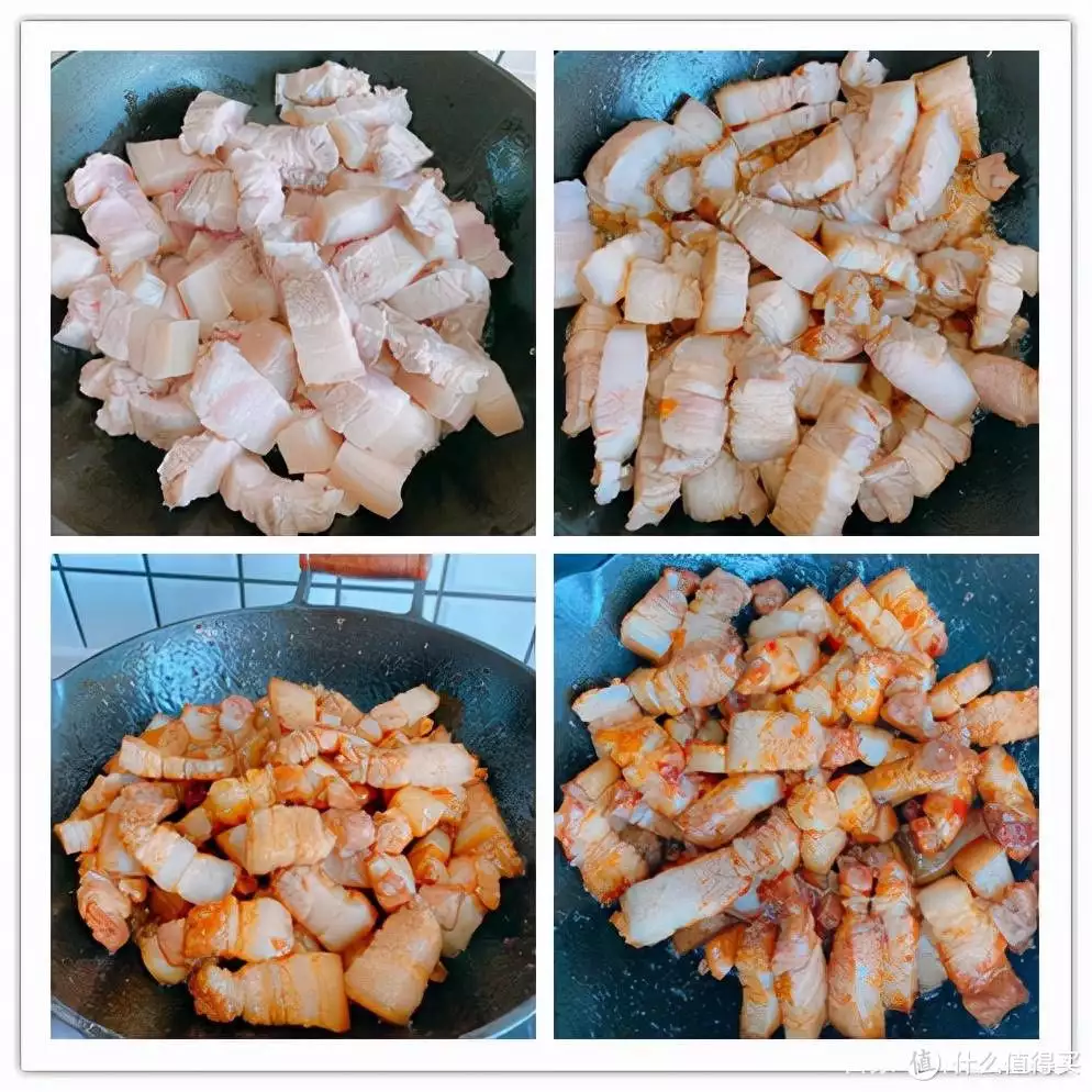 5、加入切块的五花肉,小火翻炒,五花肉是有水汽的,先把水汽炒掉,小火慢慢煸炒,你会发现,五花肉表面刚开始是裹不上冰糖的,小火慢慢煸炒,勤翻炒,把肉里面的水汽挥发掉,油脂慢慢煸炒出来,不能大火爆炒,否则糖色很容易炒过头,口感会发苦,这个过程大约需要持续5分钟;