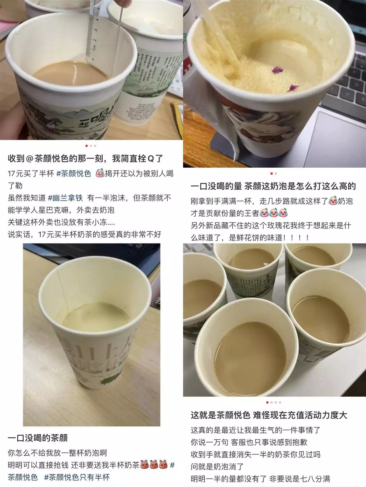 社交平台上,也有不少网友发帖吐槽茶颜悦色“一杯茶里有半杯都是奶沫”“还没喝就只剩半杯”。极目新闻记者梳理发现,茶颜悦色官方曾就“奶沫消融导致奶茶不满杯”的问题回应过多次。
