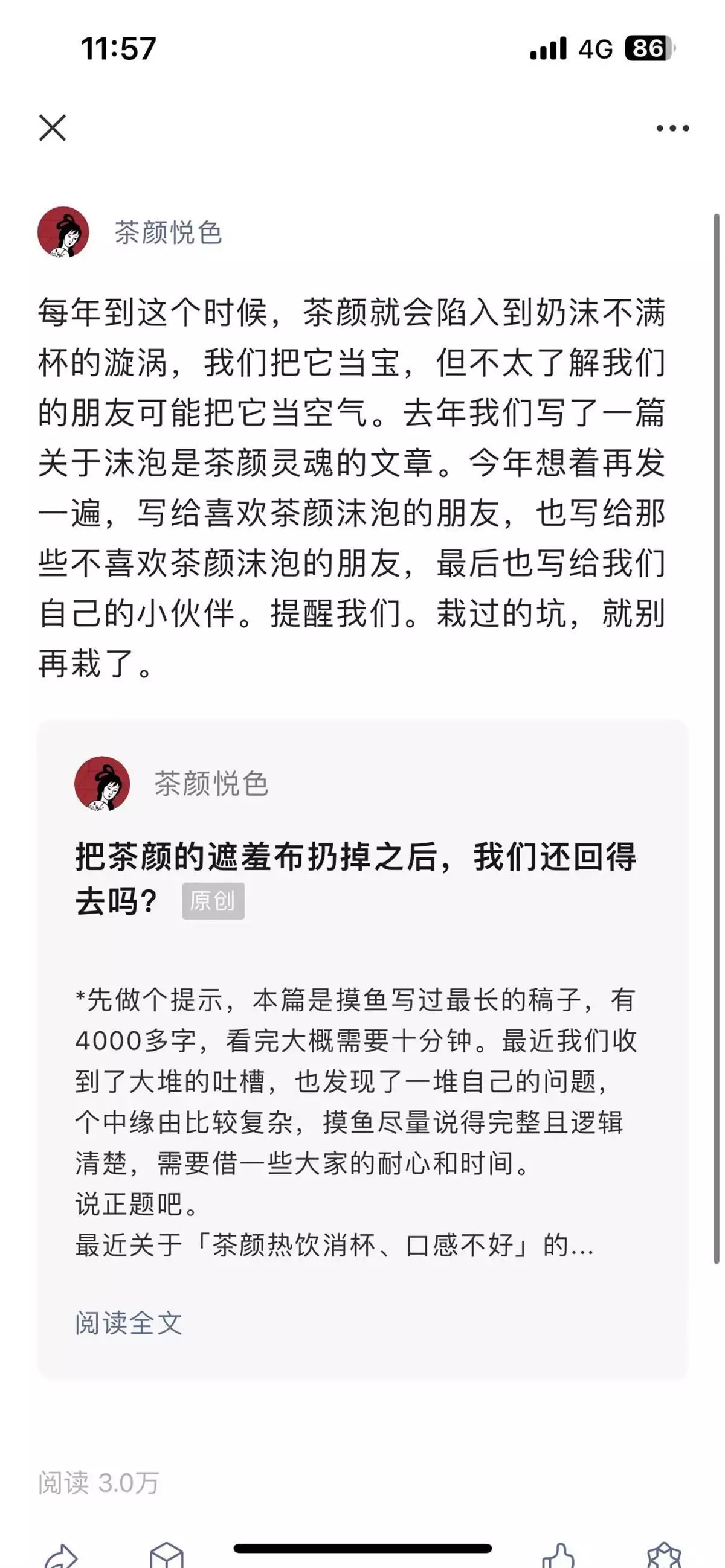 3个月前,茶颜悦色再次在微信公众号上发文称“每年到这个时候,茶颜就会陷入到奶沫不满杯的漩涡,我们把它当宝,但不太了解我们的朋友可能把它当空气。去年我们写了一篇关于沫泡是茶颜灵魂的文章。今年想着再发一遍,写给喜欢茶颜沫泡的朋友,也写给那些不喜欢茶颜沫泡的朋友,最后也写给我们自己的小伙伴。提醒我们。栽过的坑,就别再栽了。”